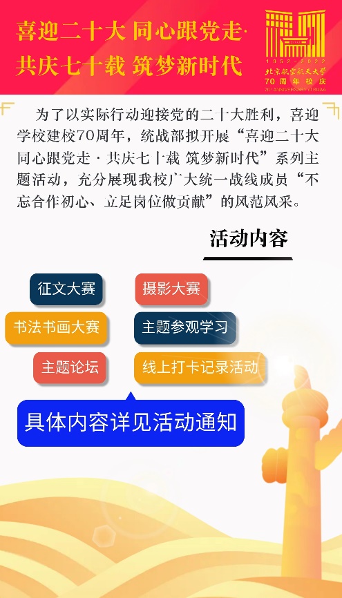 为了以实际行动迎接党的二十大胜利,学习领会中央统战工作会议精神,贯彻落实北京市第十三次党代会精神,喜迎学校建校70周年,统战部拟开展“喜迎二十大 同心跟党走·共庆七十载 筑梦新时代”系列主题活动,传承“空天报国、敢为人先”的北航精神,充分展现我校广大统一战线成员“不忘合作初心、立足岗位做贡献”的风范风采。