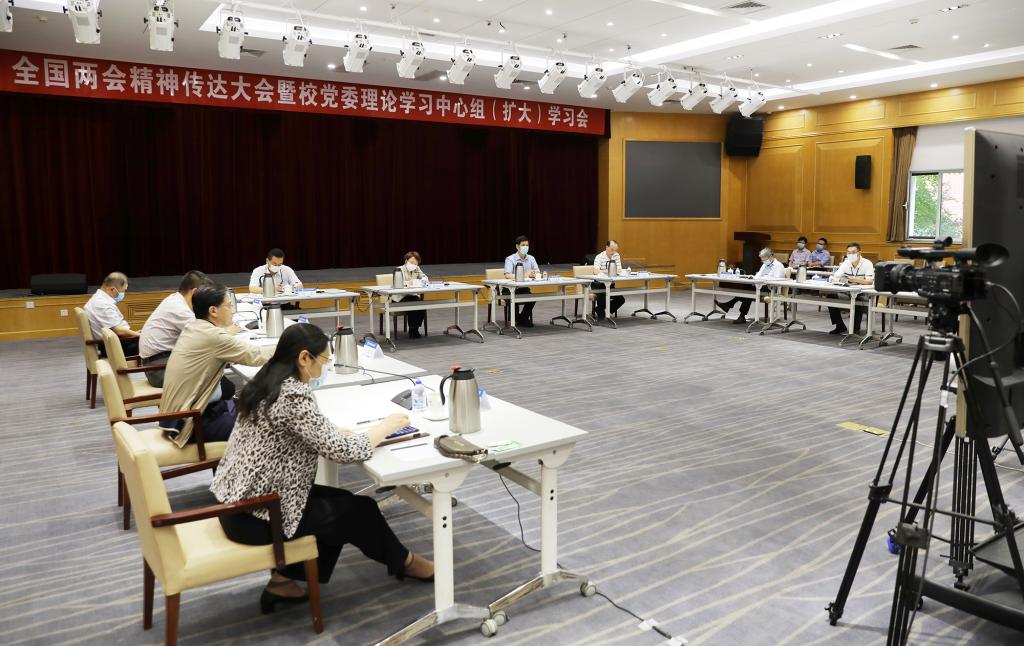 北航新闻网6月1日电(记者 高敏江/文 邸白鹭/摄影)6月1日下午,我校通过视频会议形式,召开全国两会精神传达大会暨校党委理论学习中心组(扩大)学习会,集中学习传达全国两会精神。全体校领导、校长助理,全国政协委员,党群部门负责人在如心会议中心大报告厅参加会议。校学术委员会、教学指导委员会负责人,高层次人才代表,各级人大代表、政协委员,民主党派、无党派人士、侨联代表,校教代会主席团成员,全校副处级以上干部,马克思主义学院各教研部主任,专职辅导员等300余人,在各视频会议点参加会议。会议由党委副书记赵罡主持。