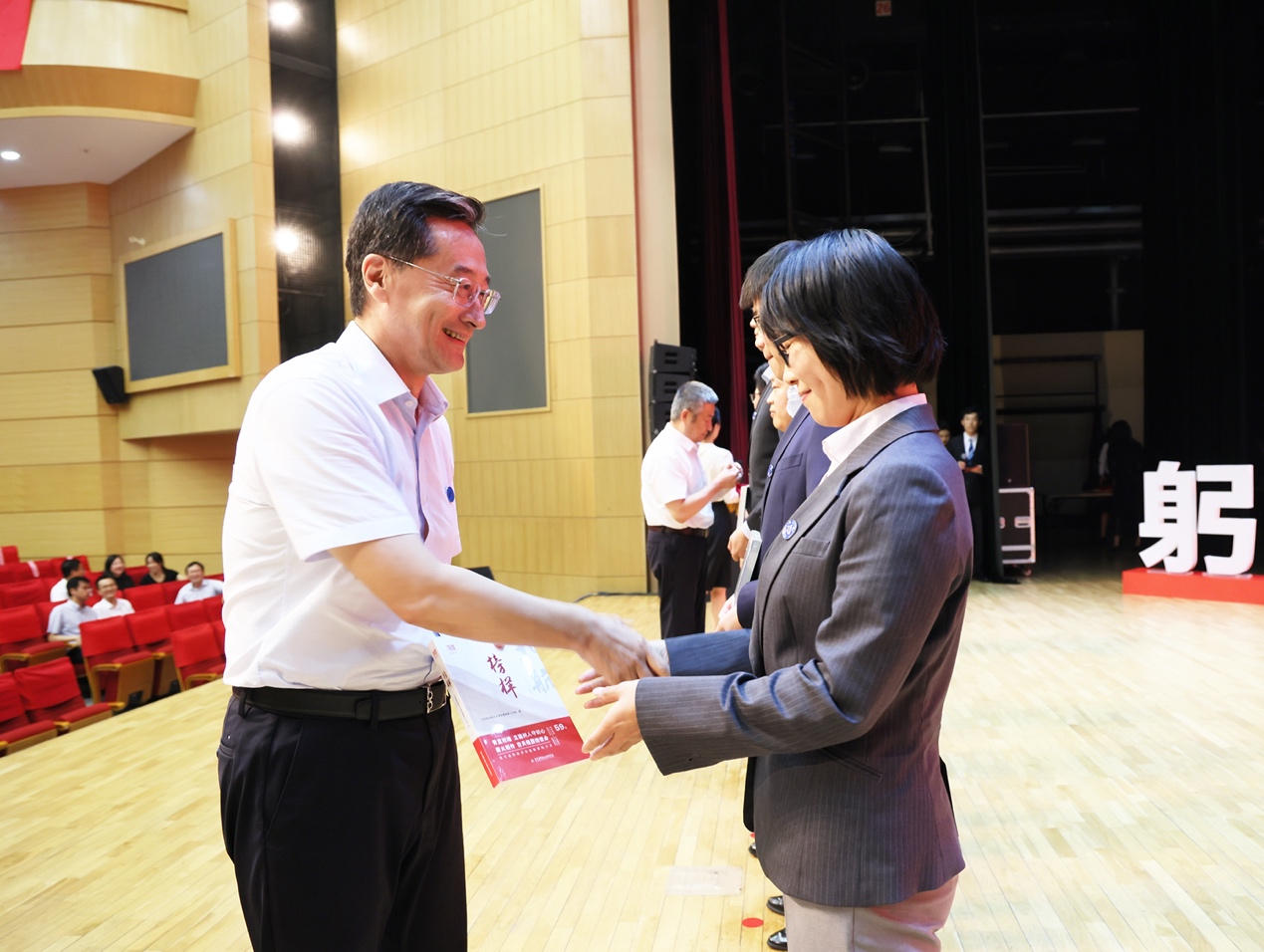 校党委书记赵长禄、校长王云鹏为新进教师代表佩戴校徽并赠送书籍《榜样》。