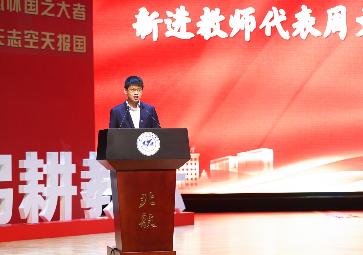 新进教师代表、机械工程及自动化学院周文彬在发言中表示,作为一名青年教师,将在未来的工作中,虚心向老教师学习,勤奋敬业、勇于创新,努力做有理想信念、道德情操、扎实学识、仁爱之心的“四有”好老师;坚守教书育人的初心,做以空天报国为内核的北航精神的传递者、学生学术道路的引领者、与学生共同成长的陪伴者,为党和国家培养更多的具有坚定信念、深厚学识,高尚品德的优秀人才。