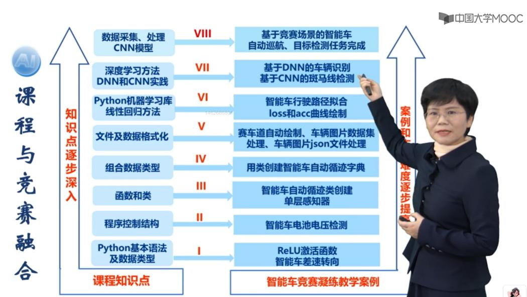 同时,针对全国大学生智能汽车竞赛中两项侧重AI 应用的赛道,徐国艳与百度联合开发了《Python深度学习与智能车竞赛实践》线上课程,于2024年2月27日在中国大学MOOC平台正式上线。这门课程设计了国内首个智能车竞赛大模型赛题,保持与技术前沿同步,将复杂竞赛任务拆解为20个渐进式小案例,形成模块化学习体系。其中,107个教学视频、143个实践案例、600多道习题及4个产业级实践项目,适配全国智能车竞赛两个侧重AI应用的实践平台,支持PaddlePaddle深度学习模型多端部署,实现与智能车硬件的无缝对接,构建起了集教学、实践、管理于一体的综合性课程。